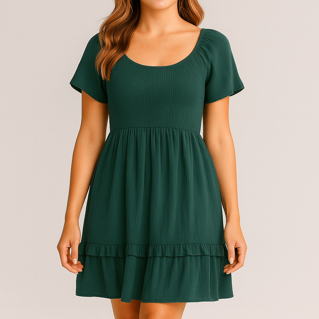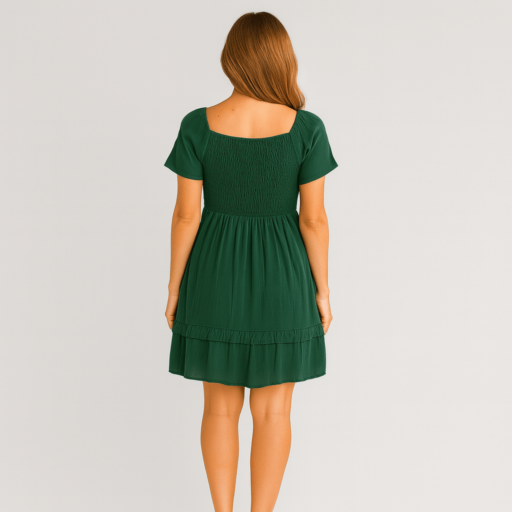 Denne korte kjole i flaskegrøn udstråler lethed og feminin charme. Overdelen med smock giver en behagelig pasform, mens det let udvidede skørt med flæsekant tilfører et legende udtryk. De korte, løse ærmer og den bløde udskæring fremhæver silhuetten på en elegant måde. Perfekt til sommer, gåture, ferier eller uformelle møder.