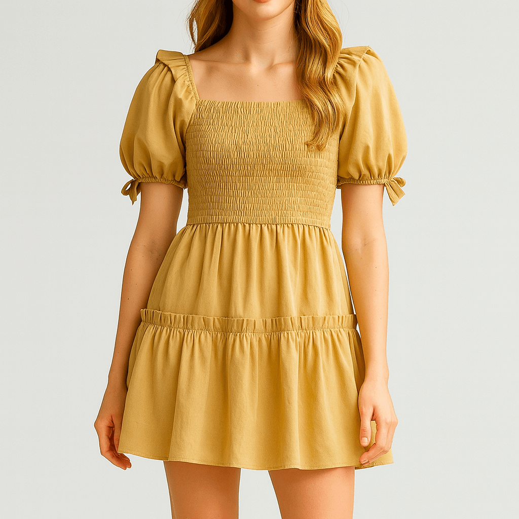 Denne korte kjole i mosterdgul udstråler lethed og feminin charme. Overdelen med smock giver en behagelig pasform, mens det let udvidede skørt med flæsekant tilfører et legende udtryk. De korte puffærmer med små bindedetaljer og den firkantede udskæring fremhæver silhuetten på en elegant måde. Perfekt til sommer, ferier, fester eller uformelle møder.