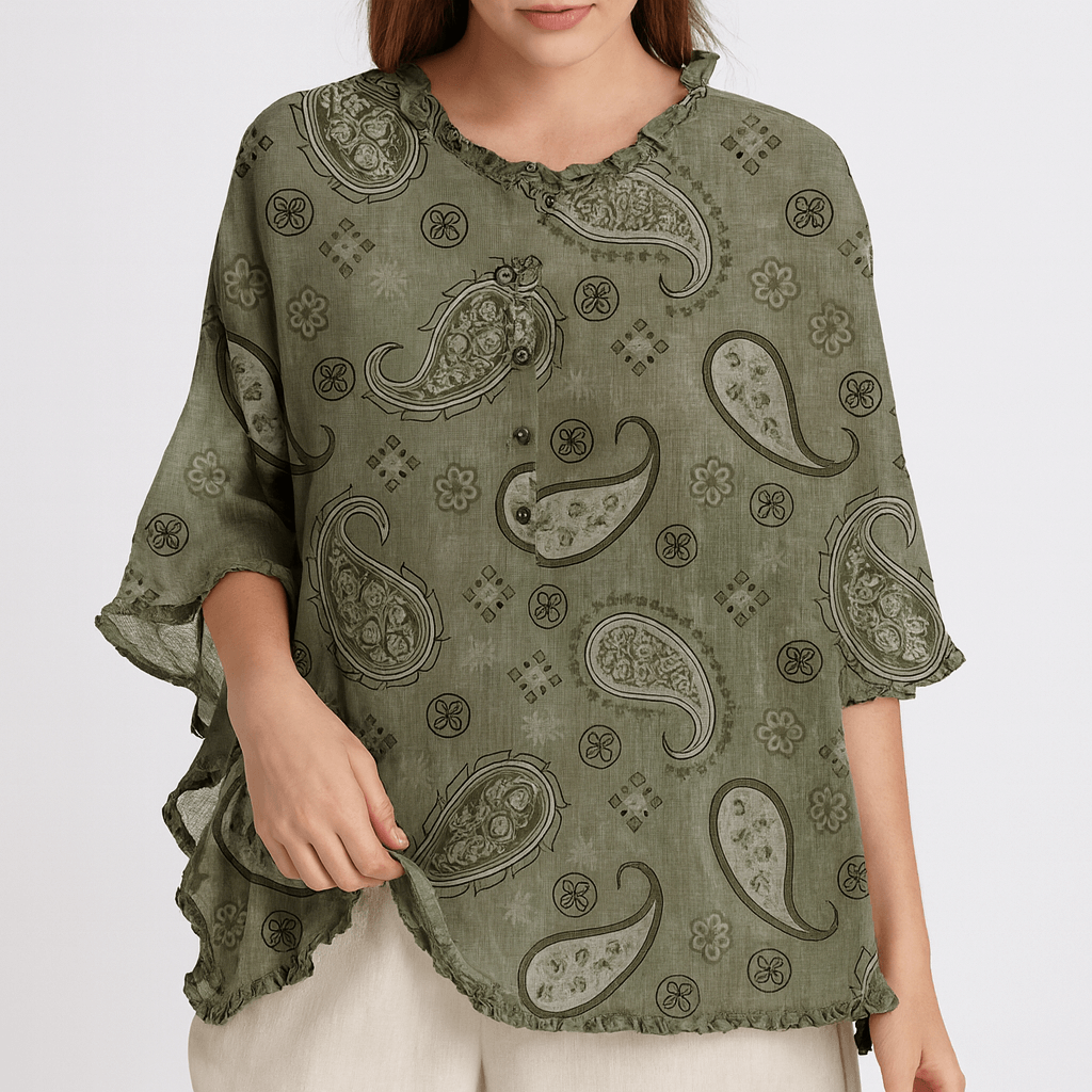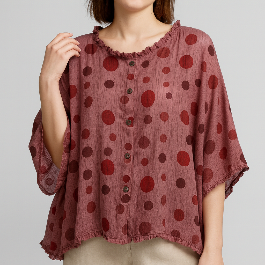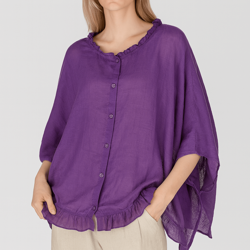 Denne bluse kombinerer stil og komfort med sit flæser trim og halværmede ærmer. Den er lavet af en blanding af bomuld og hør, hvilket giver en let og åndbar fornemmelse. Bluse har en løs pasform, der sikrer bevægelsesfrihed, og længden på størrelse L måler 27,3" fra skulder til søm. Den er ideel til at bære i varme måneder eller som en del af et lag-på-lag stil. Vaskes koldt for at bevare stoffets kvalitet.
