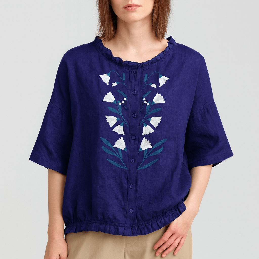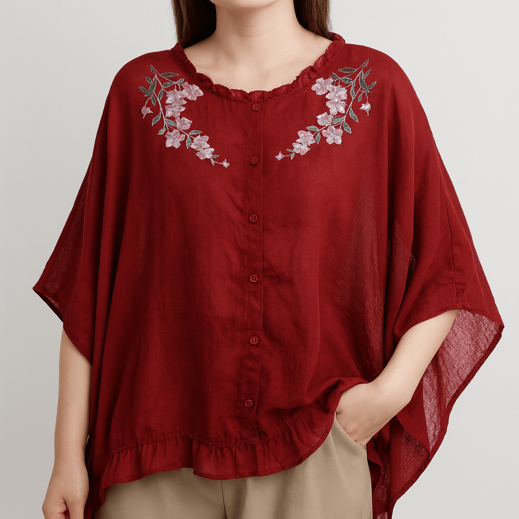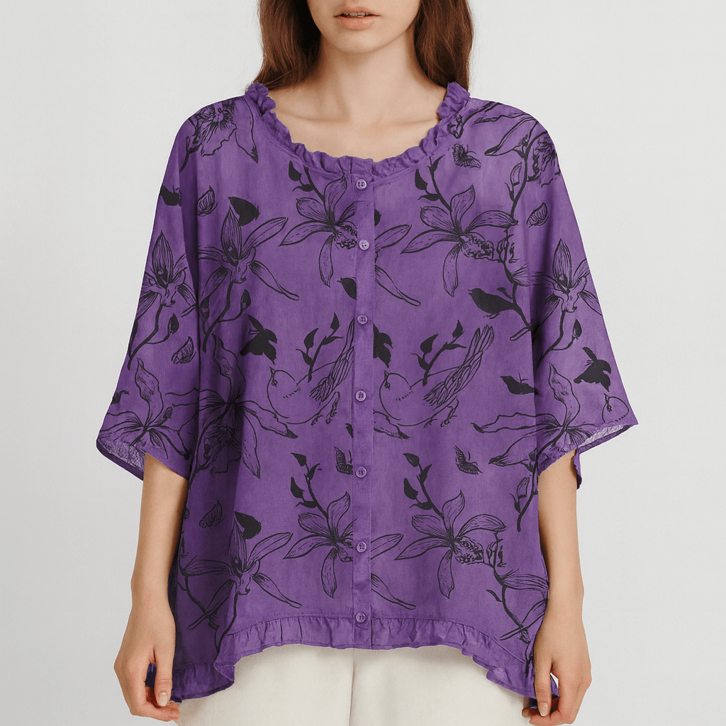 Denne bluse kombinerer stil og komfort med sit flæser trim og halværmede ærmer. Den er lavet af en blanding af bomuld og hør, hvilket giver en let og åndbar fornemmelse. Bluse har en løs pasform, der sikrer bevægelsesfrihed, og længden på størrelse L måler 27,3" fra skulder til søm. Den er ideel til at bære i varme måneder eller som en del af et lag-på-lag stil. Vaskes koldt for at bevare stoffets kvalitet.