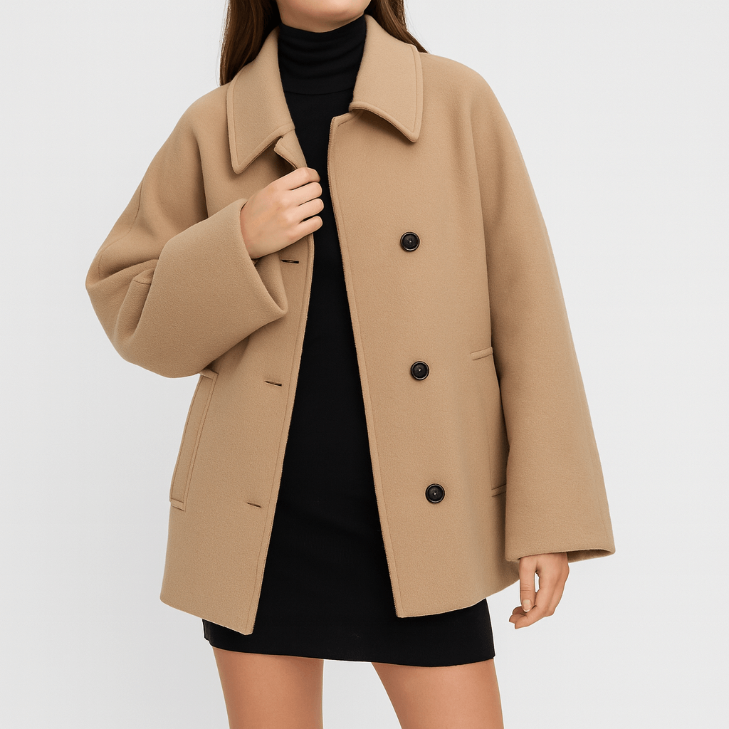 Oplev den perfekte kombination af stil og komfort med denne overdimensionerede uldfrakke. Den bløde uldblanding holder dig varm på kølige efterårsdage, mens den løse pasform giver en behagelig følelse. Frakken har en enkelt knaplukning og elegante elementer som kontrastforing, der tilføjer raffinement til din daglige påklædning. Praktiske frontlommer sikrer, at du har dine nødvendigheder lige ved hånden. Denne frakke kan nemt kombineres med dine yndlingsklæder, hvilket gør den til et alsidigt valg til enhver lejlighed.