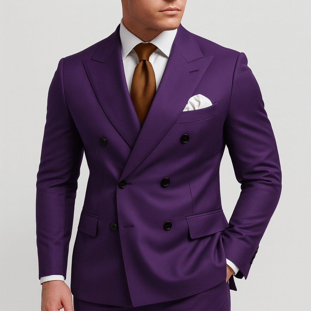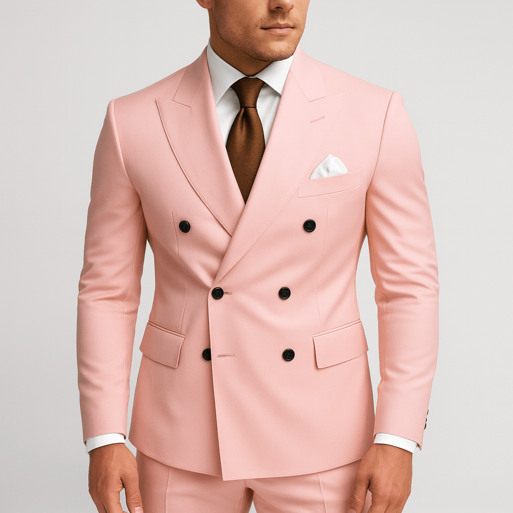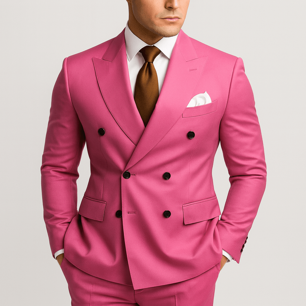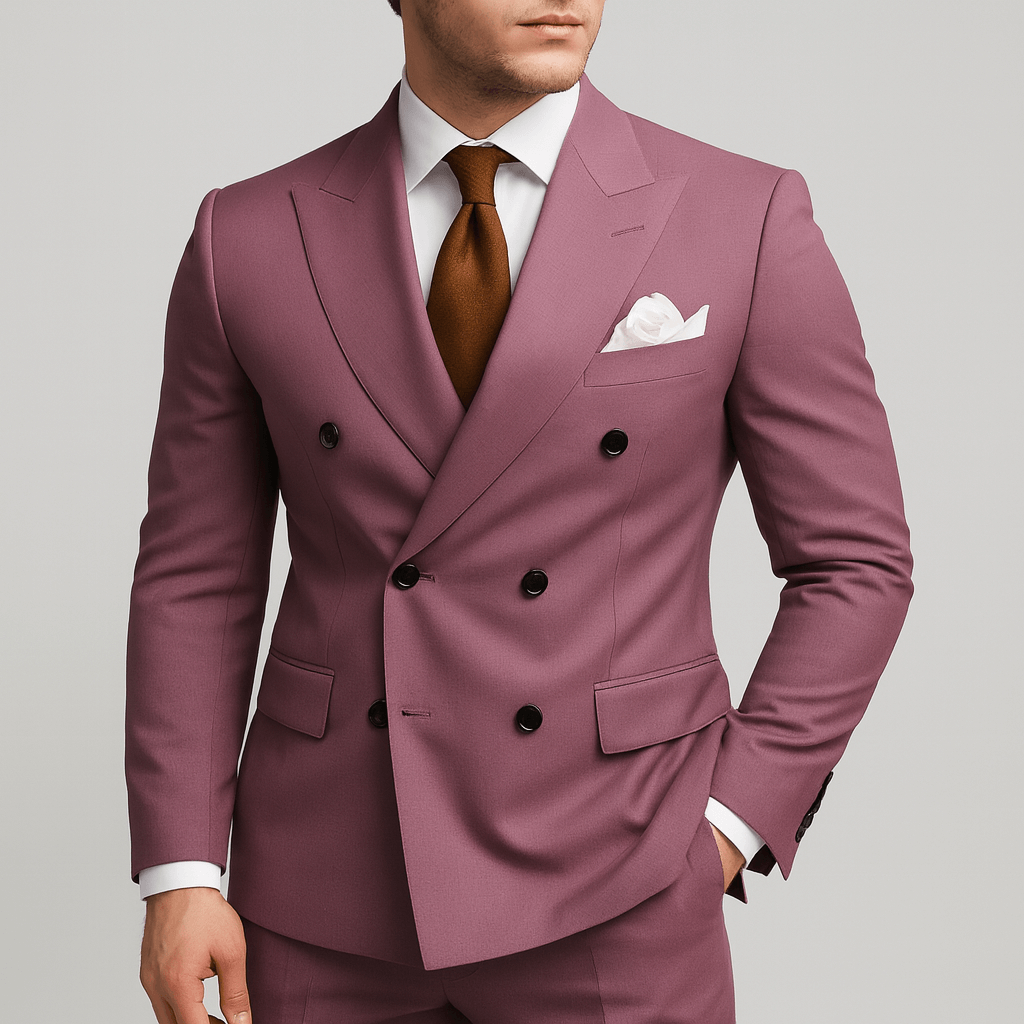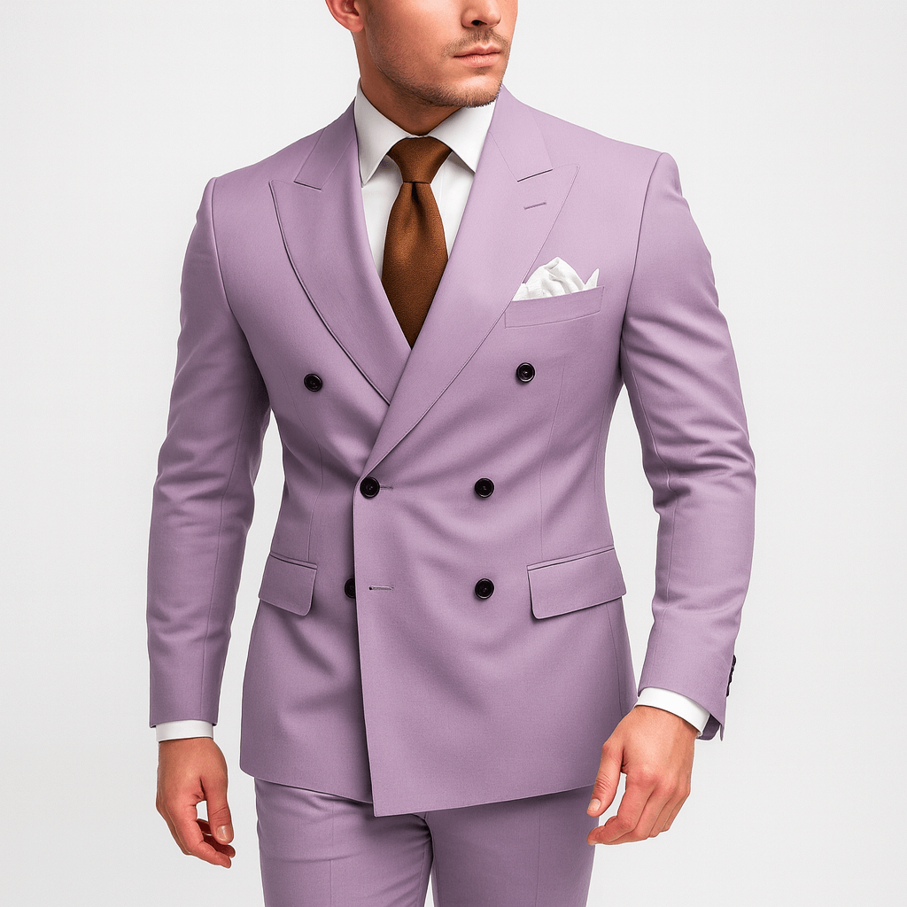 Dette slim fit dobbeltradede jakkesæt er ideelt til formelle anledninger. Jakken har et ensfarvet udseende med peak revers og flere praktiske lommer, herunder to sidelommer, en brystlomme og en inderlomme. Bukserne har en flad front og en udvidelig talje for optimal komfort. Dette sæt kan kombineres med en skjorte og slips for et klassisk udtryk eller bæres mere uformelt til festlige lejligheder.
