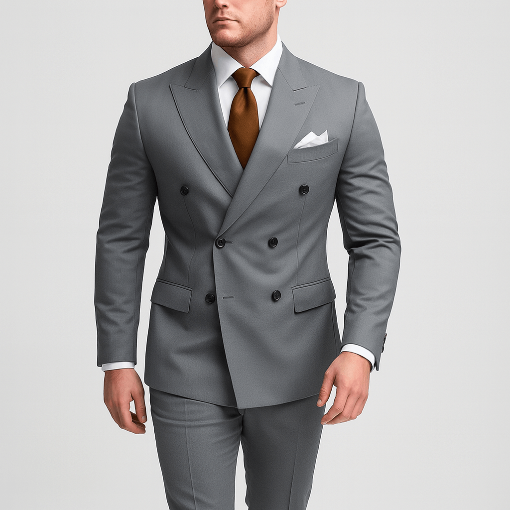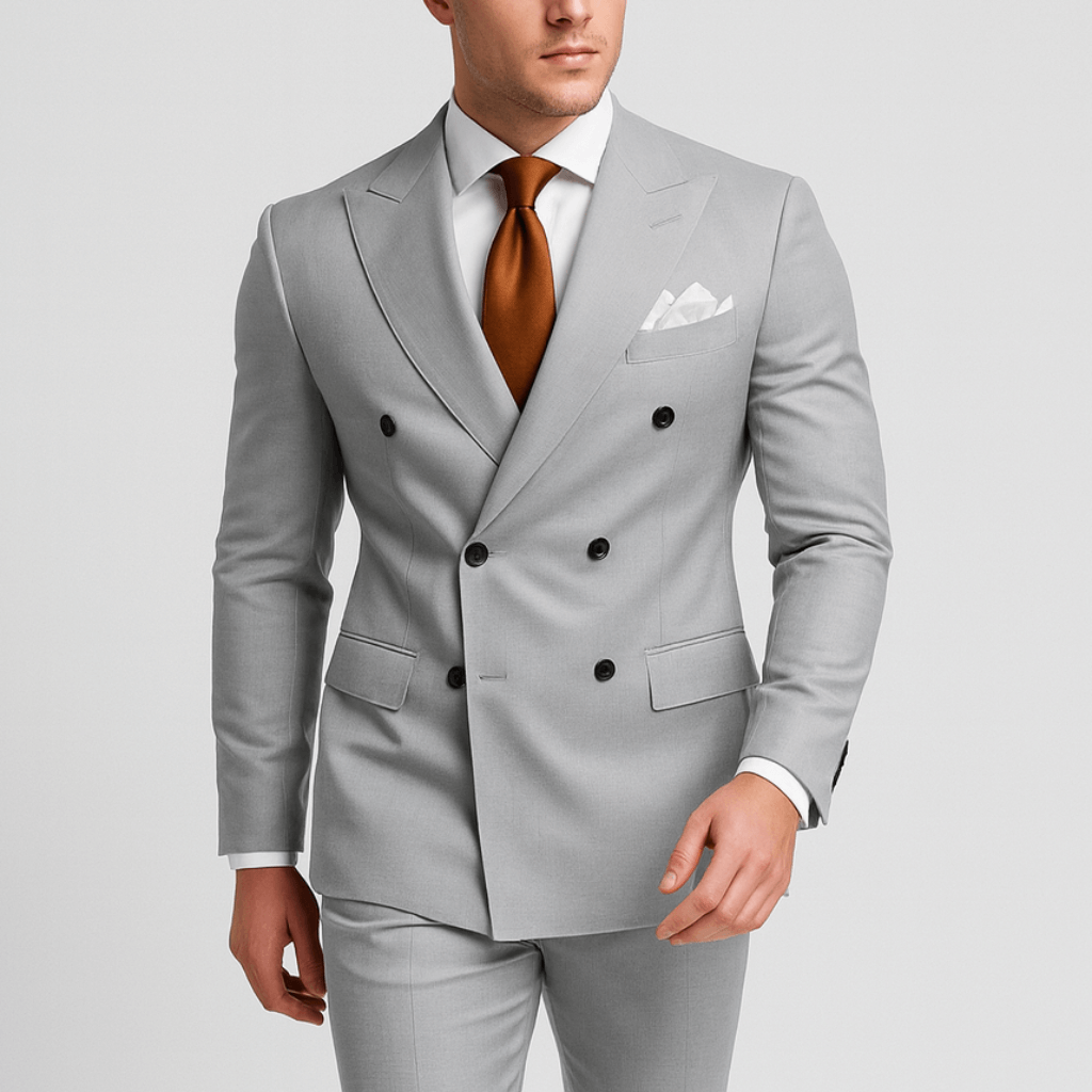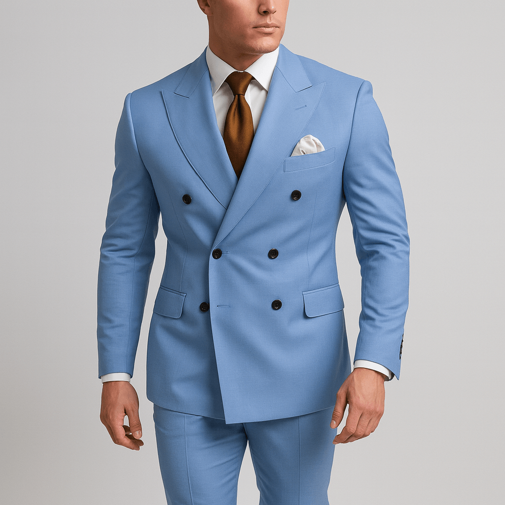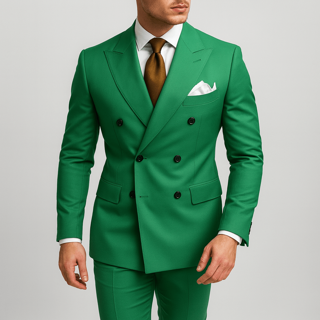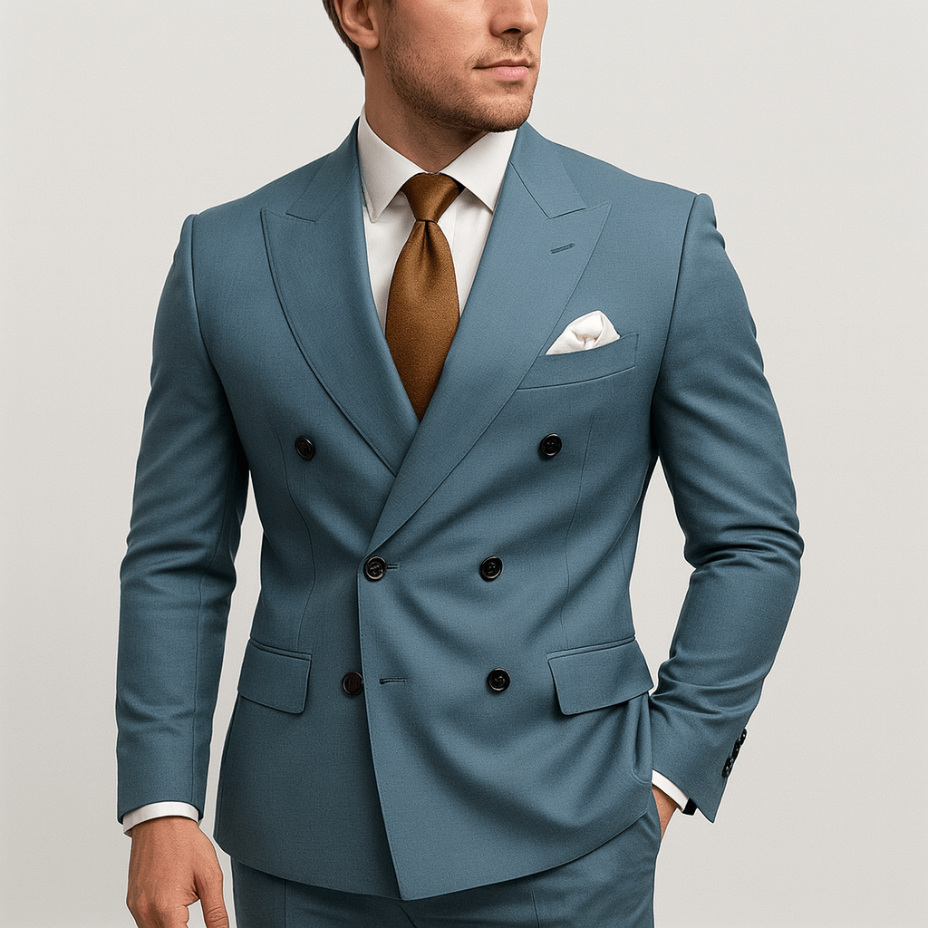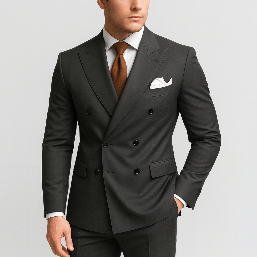 Dette slim fit dobbeltradede jakkesæt er ideelt til formelle anledninger. Jakken har et ensfarvet udseende med peak revers og flere praktiske lommer, herunder to sidelommer, en brystlomme og en inderlomme. Bukserne har en flad front og en udvidelig talje for optimal komfort. Dette sæt kan kombineres med en skjorte og slips for et klassisk udtryk eller bæres mere uformelt til festlige lejligheder.