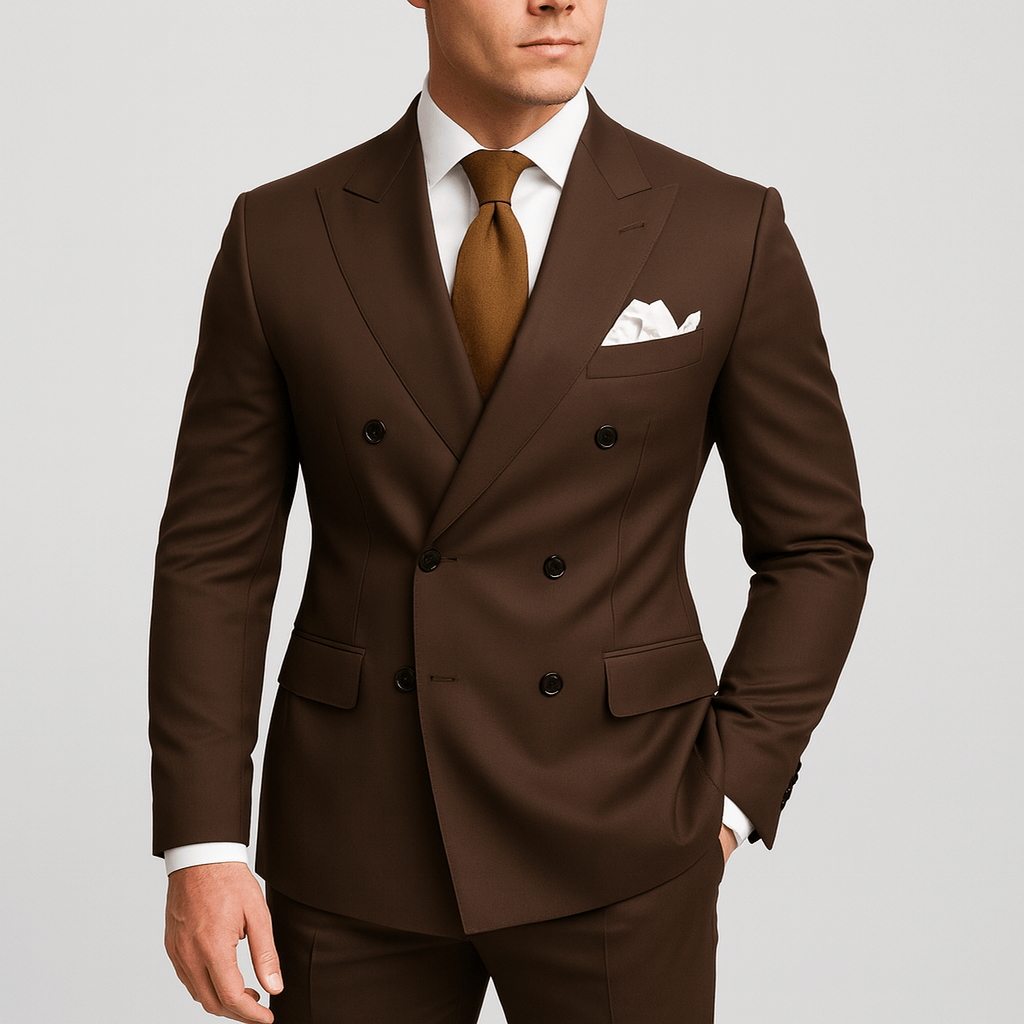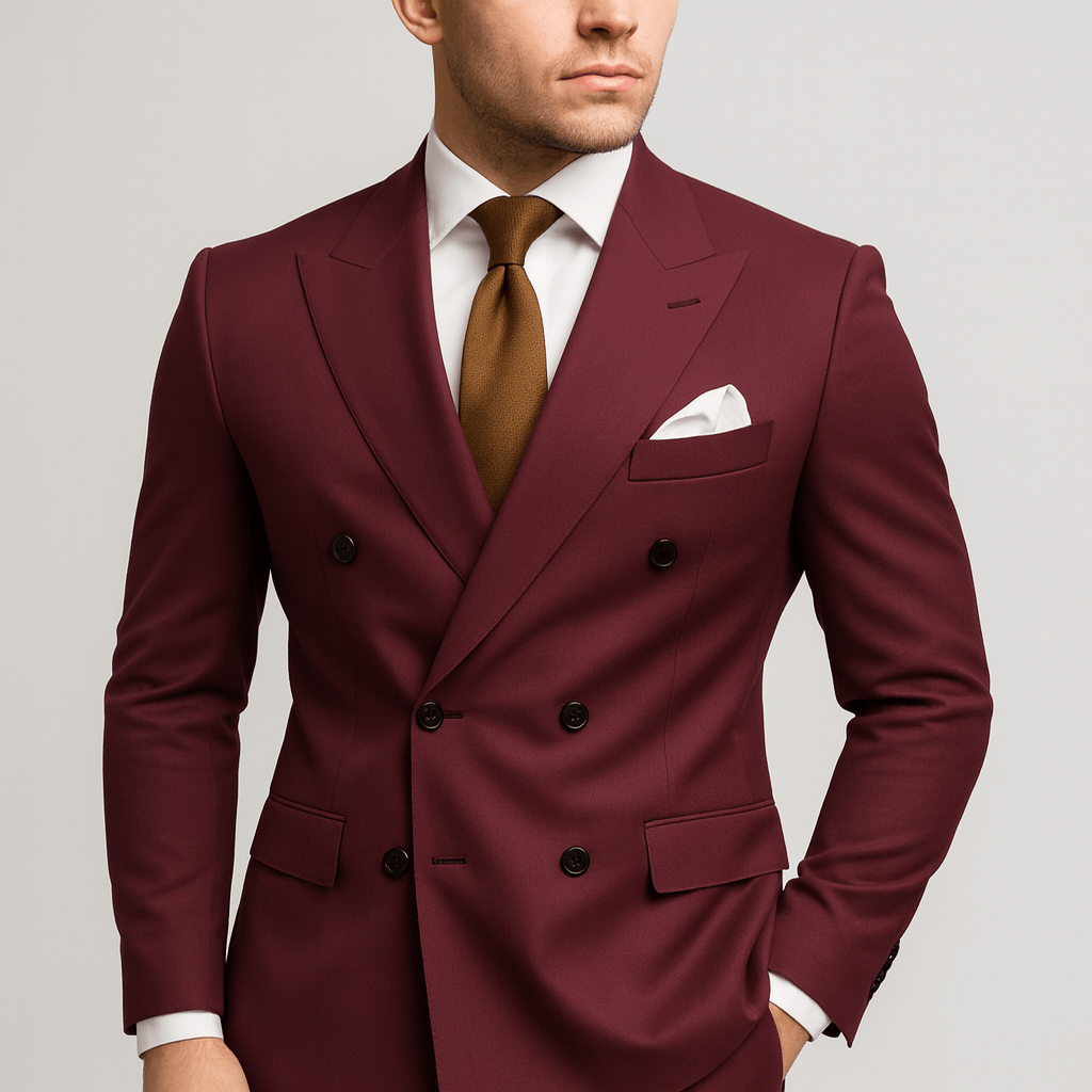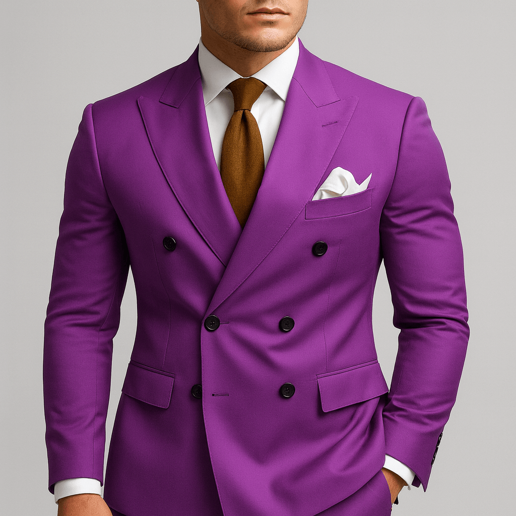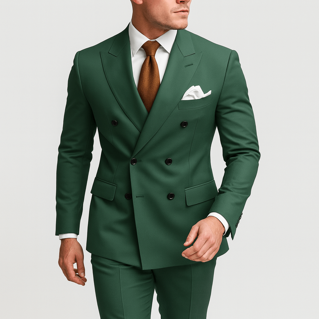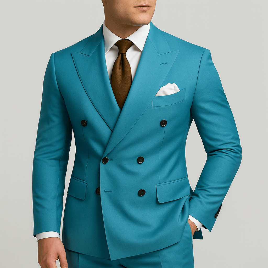 Dette slim fit dobbeltradede jakkesæt er ideelt til formelle anledninger. Jakken har et ensfarvet udseende med peak revers og flere praktiske lommer, herunder to sidelommer, en brystlomme og en inderlomme. Bukserne har en flad front og en udvidelig talje for optimal komfort. Dette sæt kan kombineres med en skjorte og slips for et klassisk udtryk eller bæres mere uformelt til festlige lejligheder.