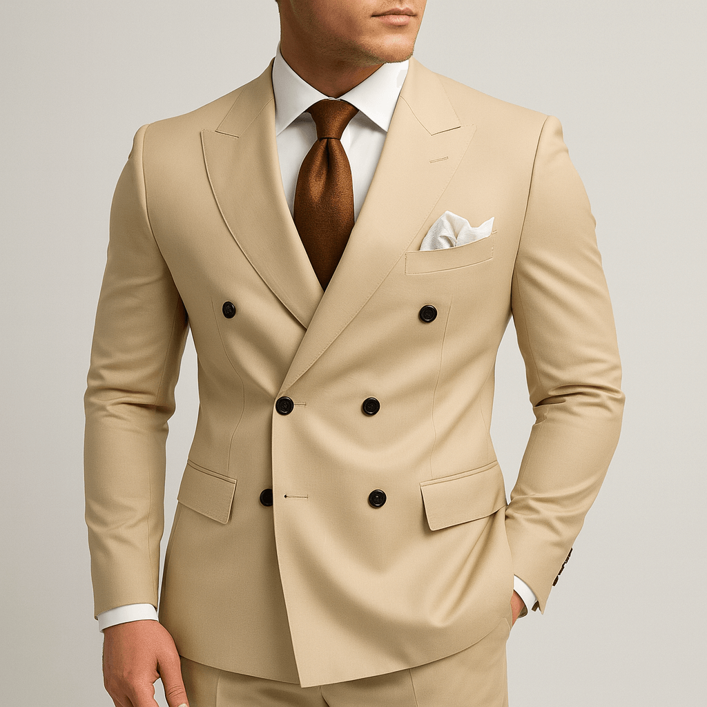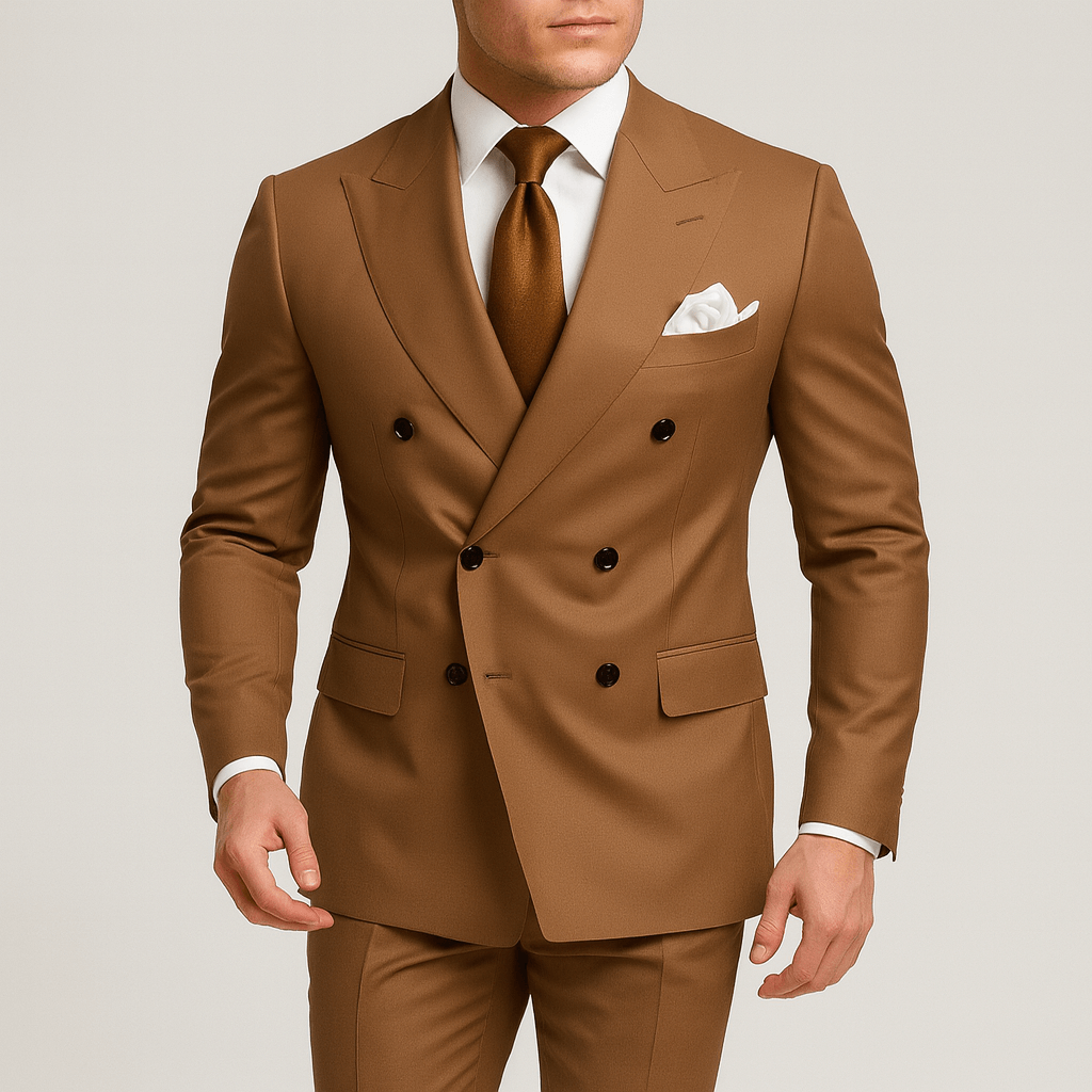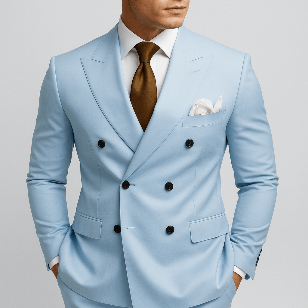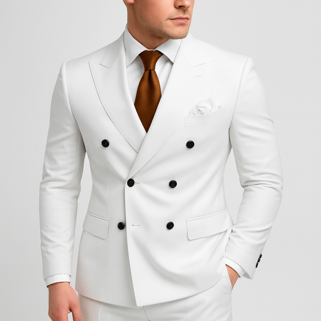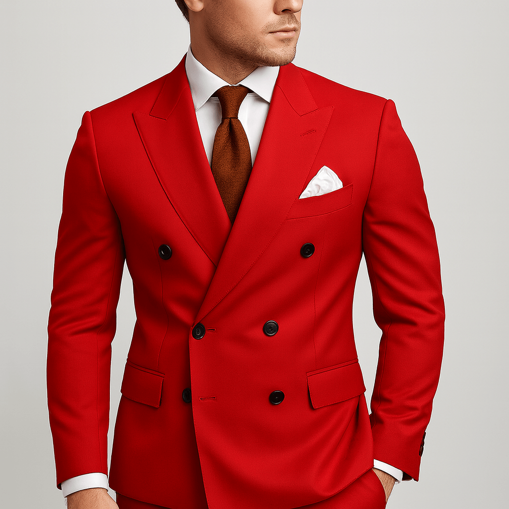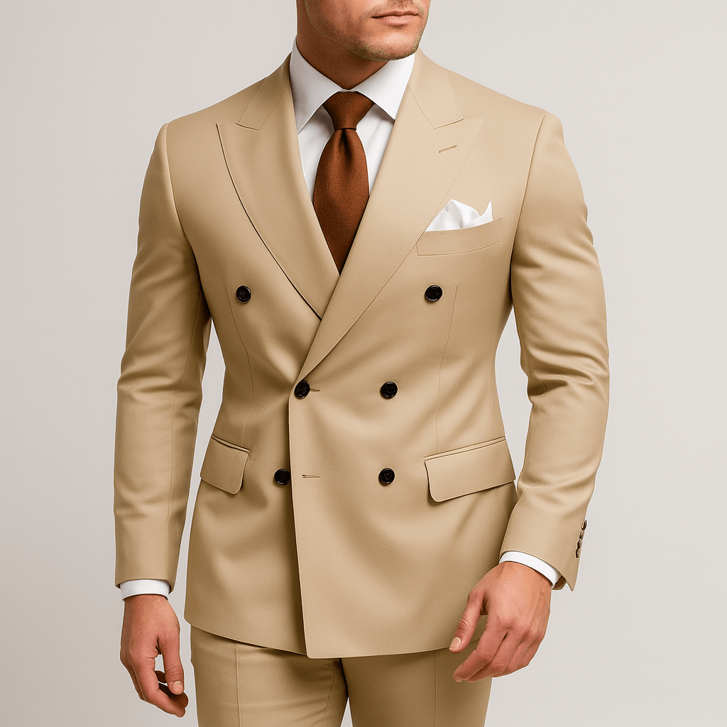 Dette slim fit dobbeltradede jakkesæt er ideelt til formelle anledninger. Jakken har et ensfarvet udseende med peak revers og flere praktiske lommer, herunder to sidelommer, en brystlomme og en inderlomme. Bukserne har en flad front og en udvidelig talje for optimal komfort. Dette sæt kan kombineres med en skjorte og slips for et klassisk udtryk eller bæres mere uformelt til festlige lejligheder.