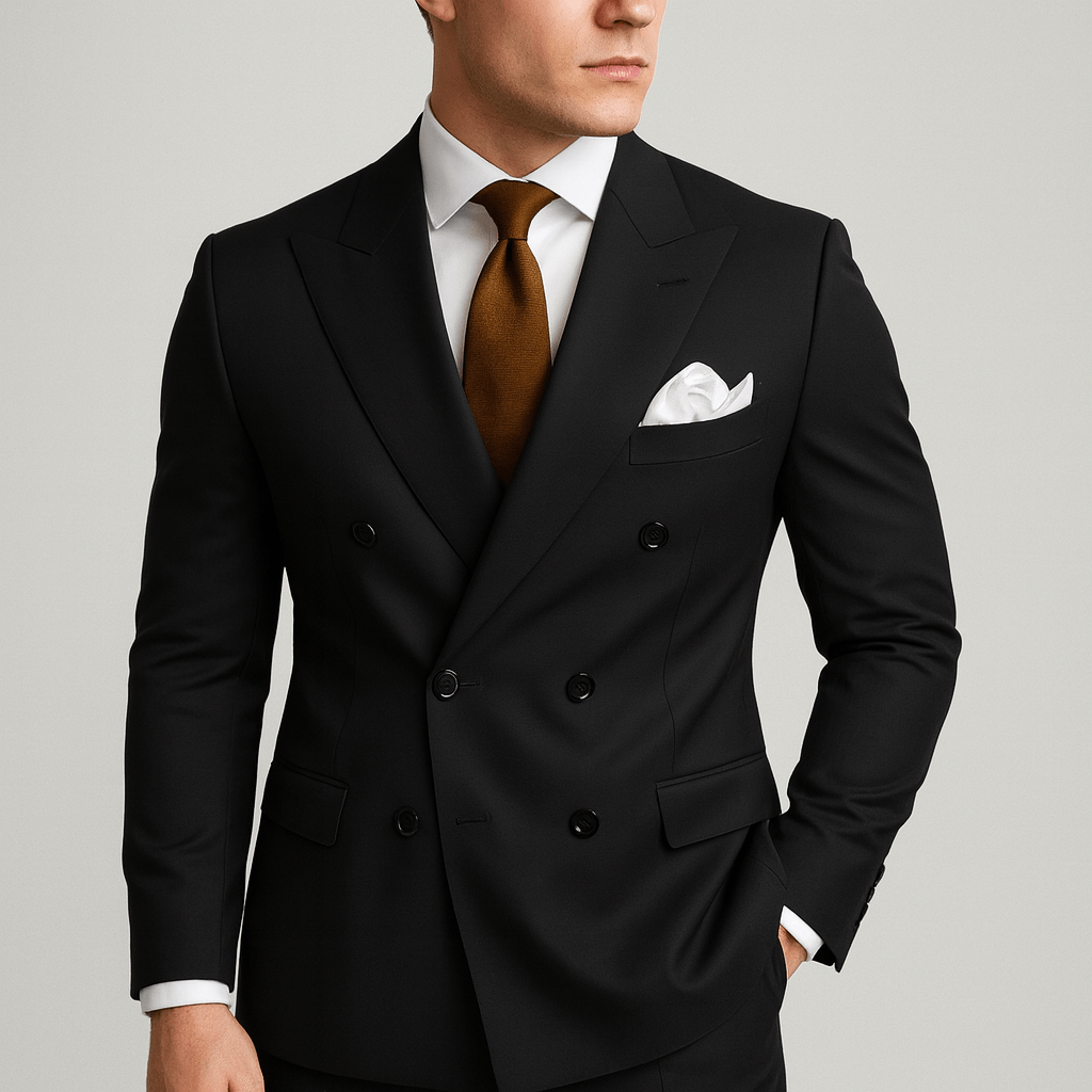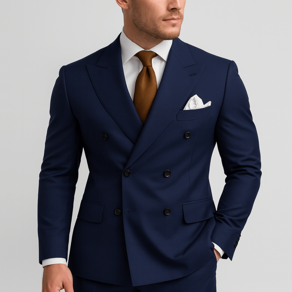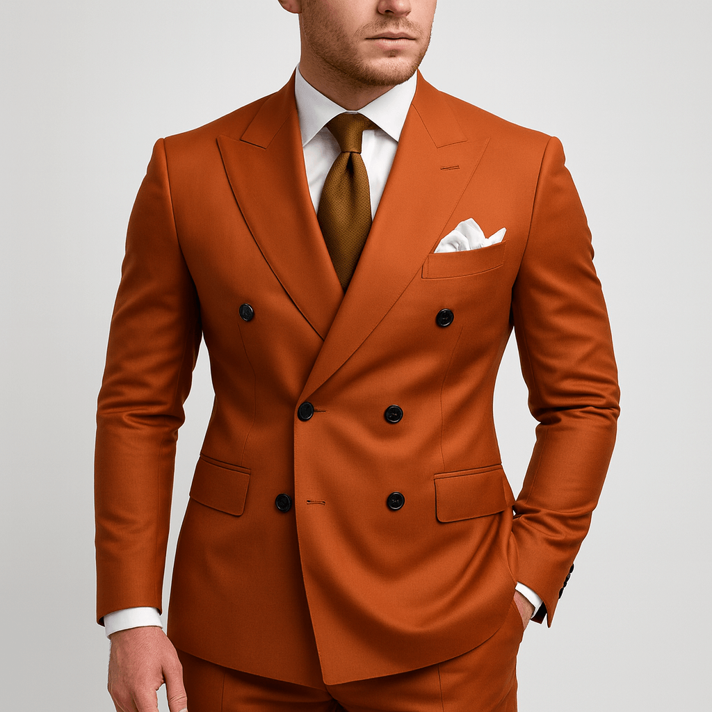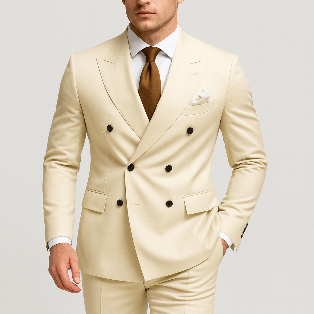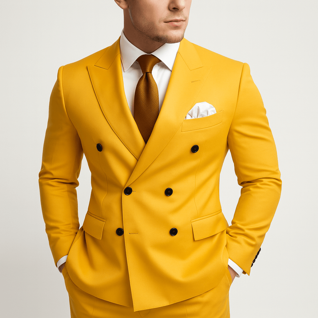 Dette slim fit dobbeltradede jakkesæt er ideelt til formelle anledninger. Jakken har et ensfarvet udseende med peak revers og flere praktiske lommer, herunder to sidelommer, en brystlomme og en inderlomme. Bukserne har en flad front og en udvidelig talje for optimal komfort. Dette sæt kan kombineres med en skjorte og slips for et klassisk udtryk eller bæres mere uformelt til festlige lejligheder.