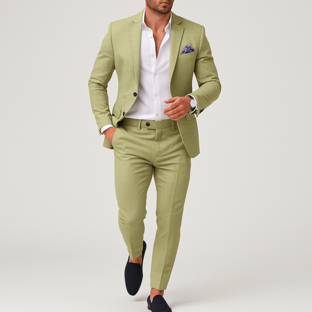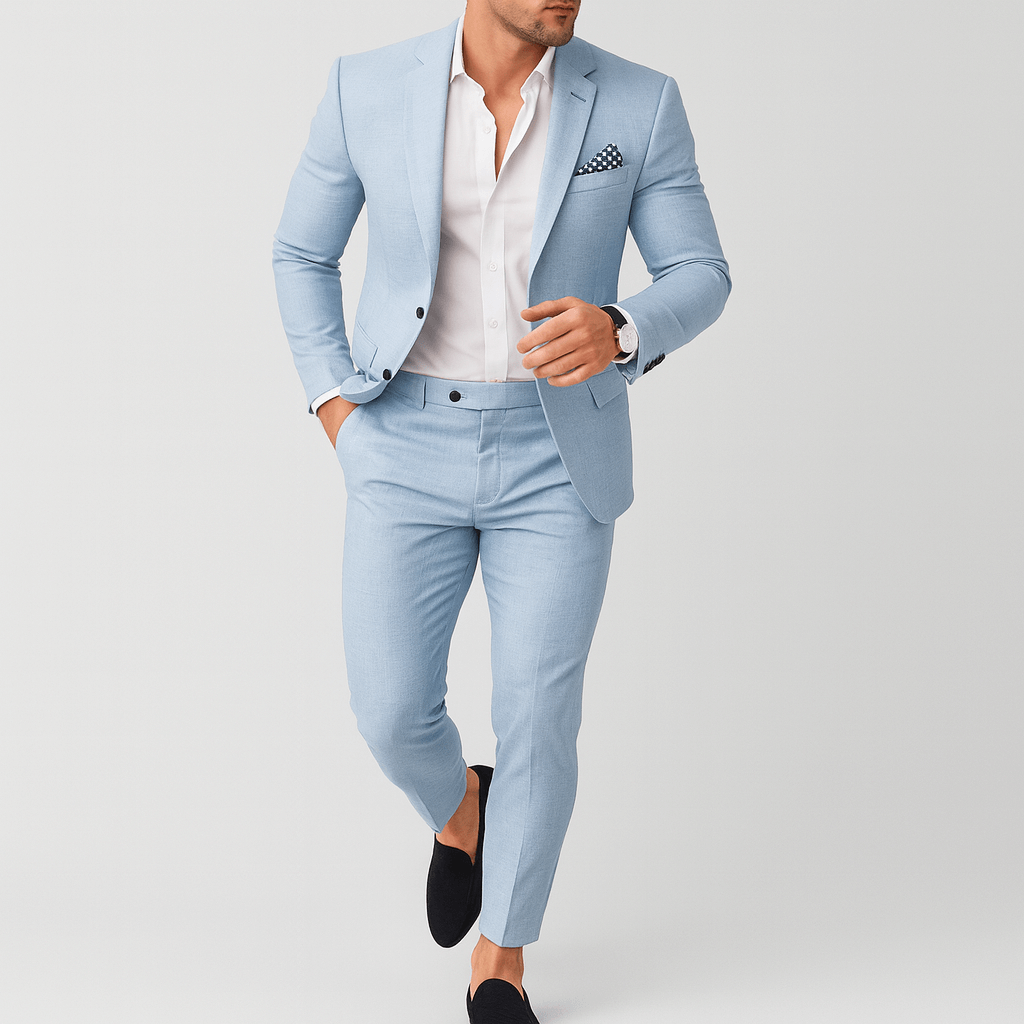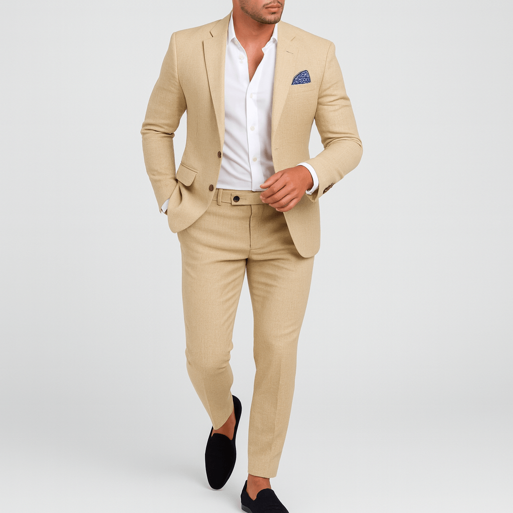 Oplev komfort og stil med denne 2-delte hør-blandingsdragt, perfekt til varme lejligheder. Med en slank pasform er denne dragt ideel til sommerbryllupper, forretningsmøder eller uformelle sammenkomster. Den åndbare hør-bomuldsblanding sikrer, at du forbliver kølig, mens du ser præsentabel ud. Kombiner den med en skjorte og loafers for et formelt udtryk, eller vælg en t-shirt og sneakers for en mere uformel stil.