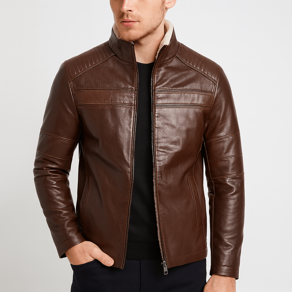 Oplev vores unikke læderjakke, designet til at fange opmærksomhed. Denne jakke er lavet af formet læder (PU), hvilket sikrer en autentisk følelse og stil. Den er designet til at blive bedre med tiden, og vores ekspertbelægning gør den modstandsdygtig over for vand og ridser. Jakken har en perfekt pasform, som sikres ved at give os dine mål, så vi kan tilpasse den til dig. Vi kontakter dig for at bekræfte målingerne, så du kan være sikker på, at du får den ideelle jakke.