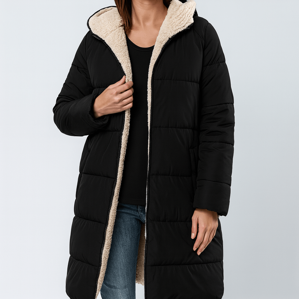 Hold dig varm og stilfuld denne vinter med vores lange vinterjakke. Denne jakke er skabt til at være alsidig, hvilket giver dig mulighed for at skifte mellem to forskellige udtryk, perfekt til både elegante og afslappede anledninger. Den lange skæring og hætten beskytter dig mod barske vinterelementer, mens teddy foringen sikrer uovertruffen varme og blødhed. Ideel til lagdeling, denne jakke kan bæres over en sweater eller en let top for ekstra komfort i kolde måneder.