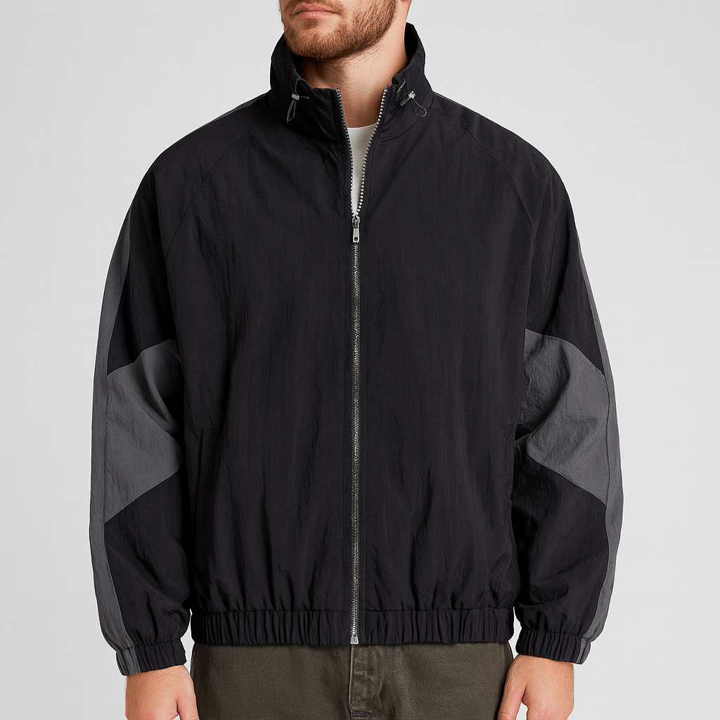 Denne vintage-inspirerede jakke kombinerer et moderne farveblokmønster med en behagelig, løs pasform. Den er lavet af slidstærk nylon og har en aftagelig lynlås, hvilket gør den perfekt til uformel gadebeklædning. Jakken er ideel til foråret og efteråret og tilføjer et stilfuldt præg til din garderobe. Den lette nylon gør den praktisk og let at vedligeholde, da den kan maskinvaskes. Kombiner den med en hættetrøje og sneakers for et nutidigt, urbant udtryk.